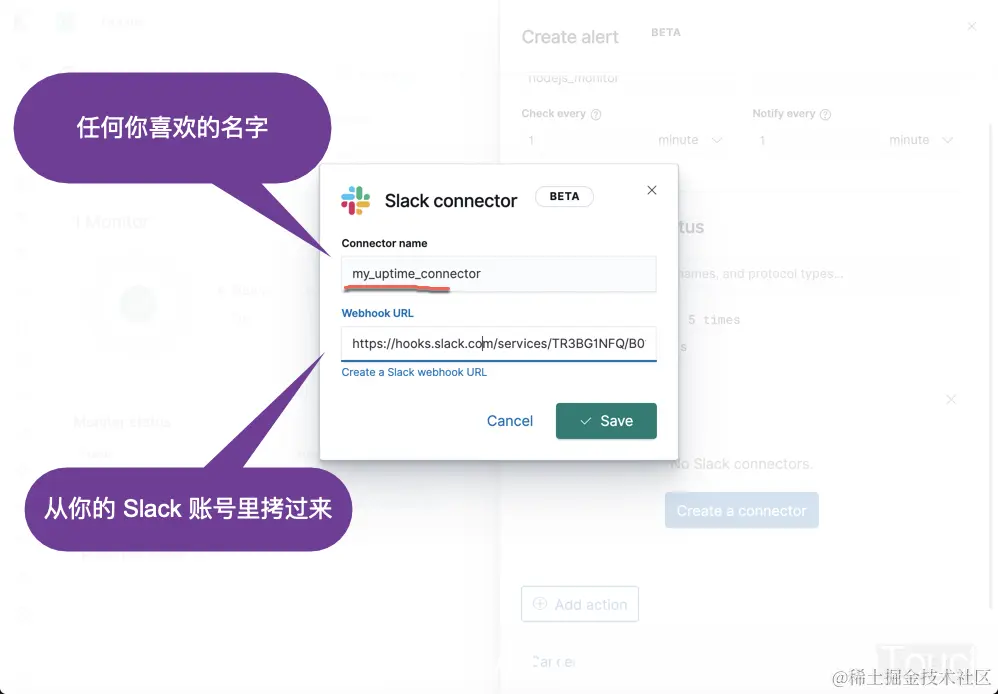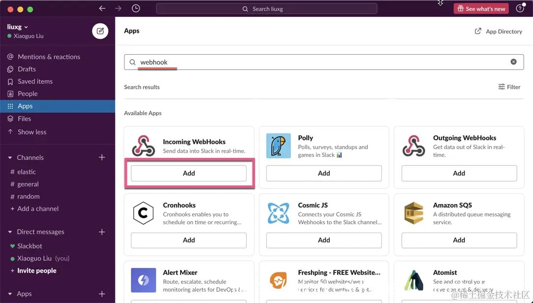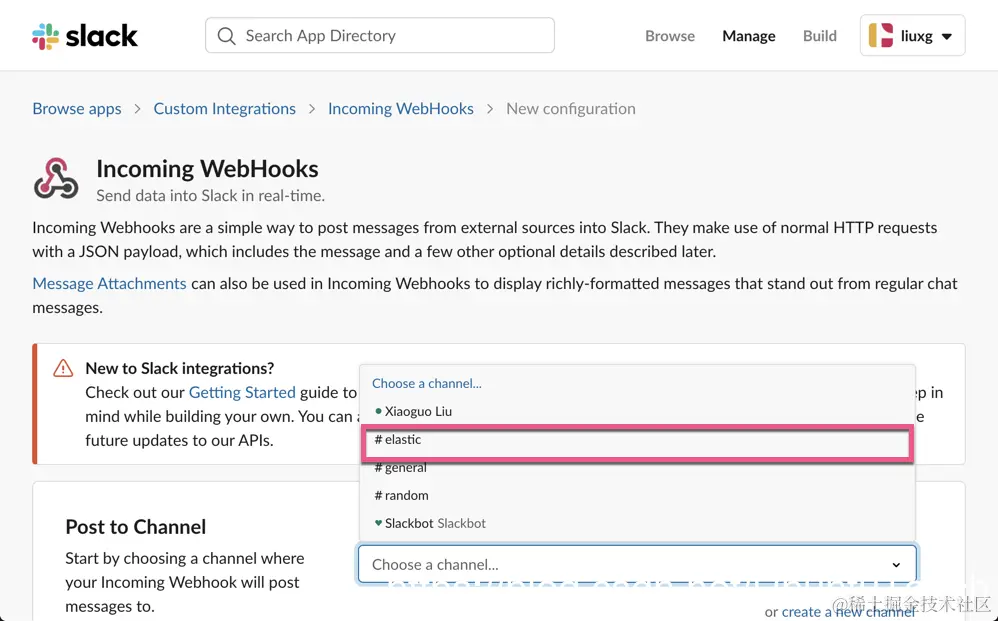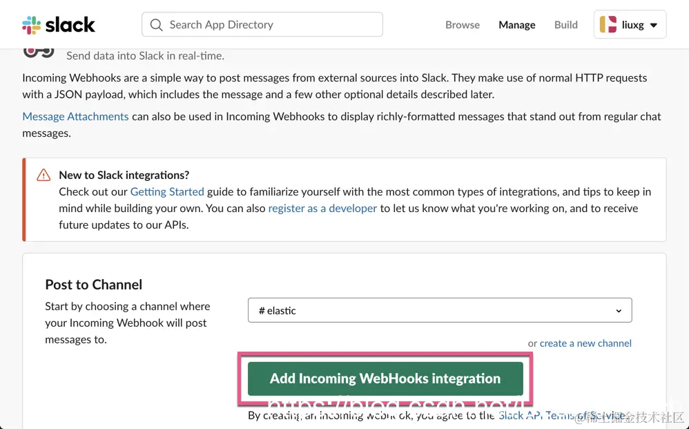 你可以参考链接 “Configuring Slack Account”来配置自己的Slack账号,并生成一个相应的一个Webhook URL。这个URL将会在Elasticsearch里进行使用。