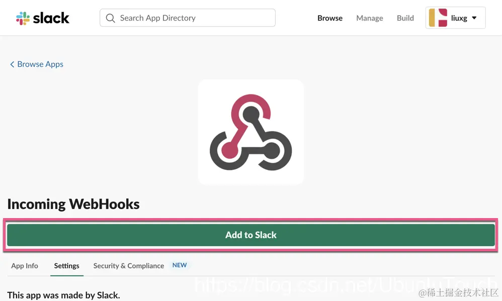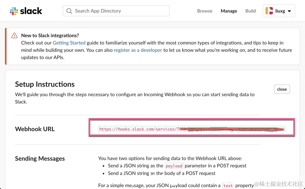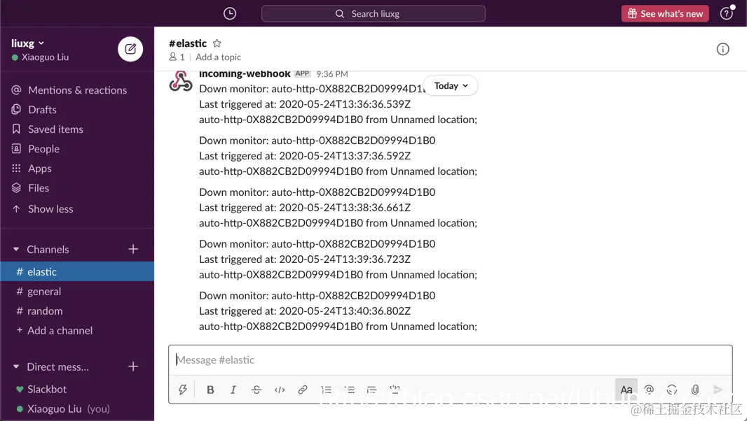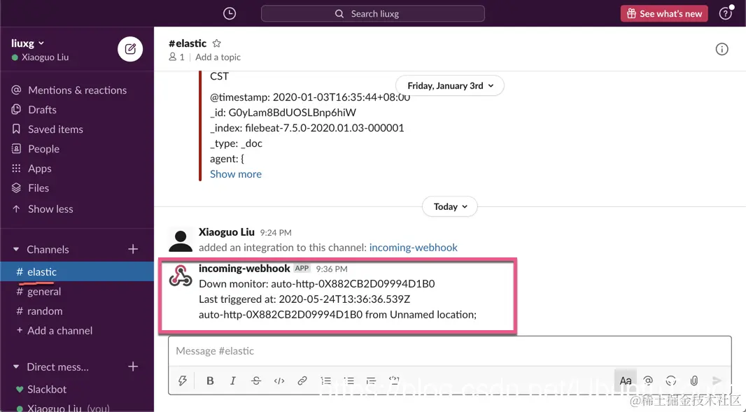 这个时候,在我们的 Slack 中可以看到如下的信息: