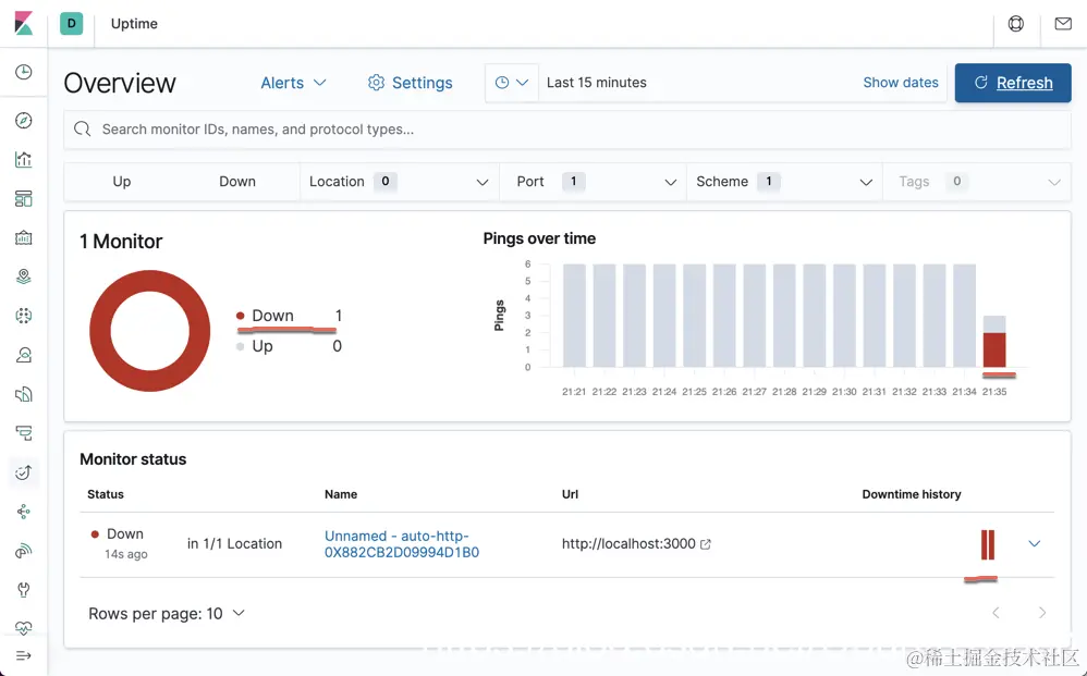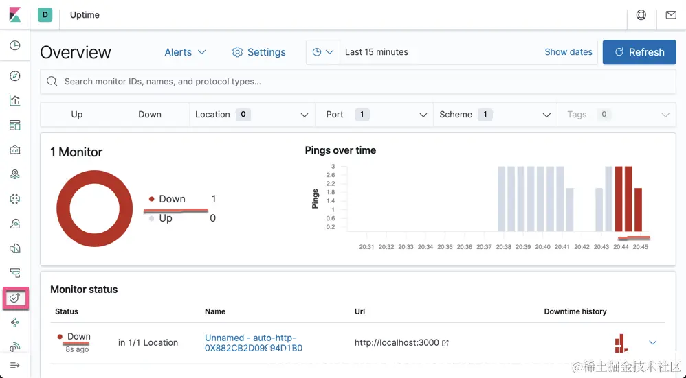 上面显示我们的 nodejs_monitor 已经被创建好了。接下来,我们开始来做测试。我们把 samplenodejs 应用关掉。然后,我们也在 Kibanan 中的 Uptime 中可以看到: