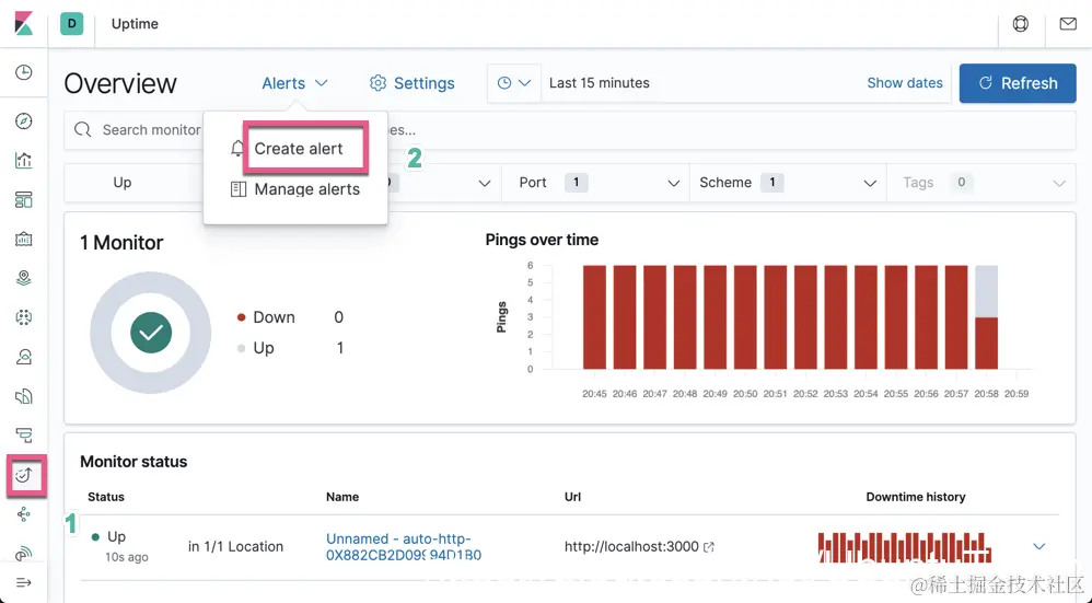 显然在上面显示了网站的运行情况。网站目前是 Down 的状态,表明我们的网站已经挂了。在接下来的练习中,我们将使用 Elastic 7.7 版本中所提供的功能来进行警报通知。为了下面的测试,我们重新运行起来我们的 nodejs 网站。