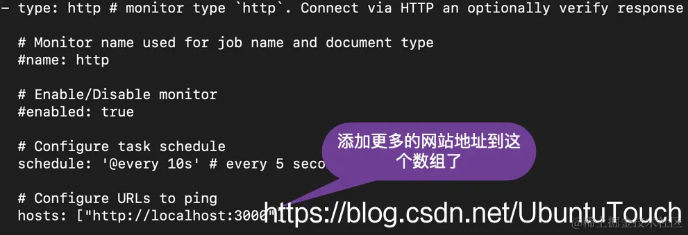 如上所示,上面的 hosts 是一个数值。我们可以添加更多的网站地址到这个数组中,从而使得我们的监控可以多达数个网站。