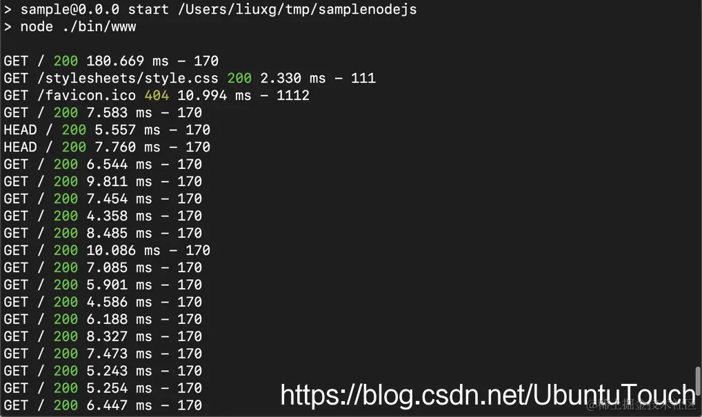 上面显示我们的网站 localhost:3000 的运行情况。目前显示是正常运行的。没有任何的错。在 samplenodjs 的 console 中我们可以看到如下的输出:
