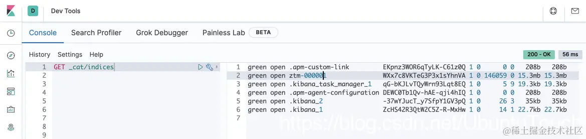 打开 Kibana,并使用如下的命令: