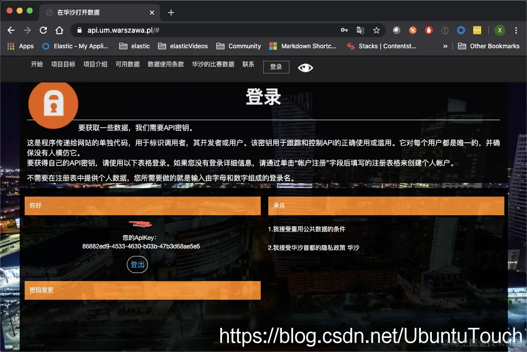为了测试这个应用,我们必须得到相应的华沙公共交通信息的 API key。我们可以在地址 api.um.warszawa.pl/# 进行申请。由于是我们不懂的文字,需要翻译中文才可以了: