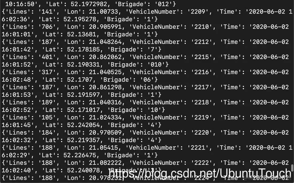 上面的代码其实是蛮简单的。它定时从 API portal 获取公交系统的位置信息,并转发到 Kafka。