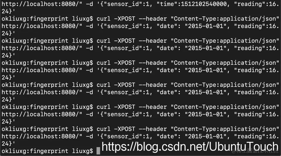curl -XPOST --header "Content-Type:application/json"http://localhost:8080/" -d '{"sensor_id":2, "date": "2015-01-01", "reading":16.24}'
