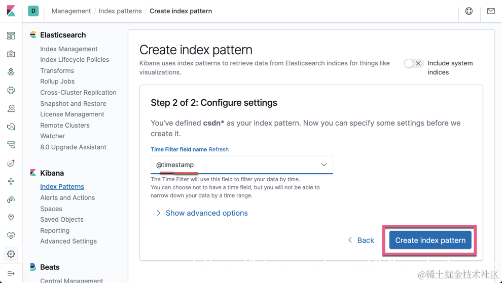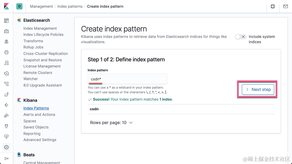 为了分析索引 csdn,我们必须为之创建一个 index pattern:
