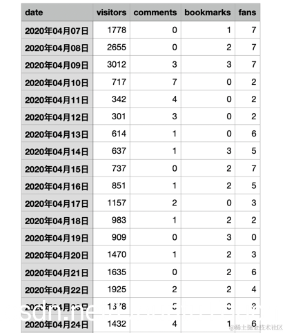 点击上面的 “导出数据”,我们就可以得到所有关于文章的阅读量,评论数,粉丝数及收藏数。