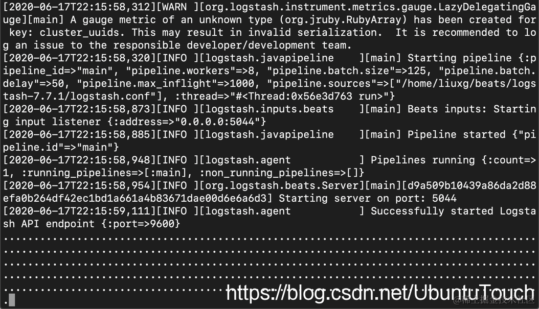 在上面,Logstash 侦听端口 5044。如果有数据,我们直接显示 dot,也就是点。