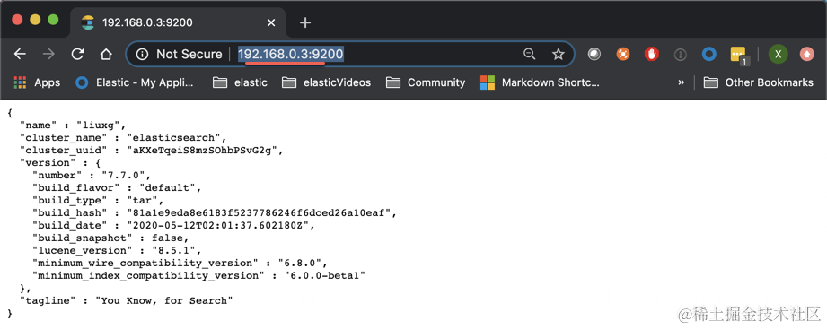 这样我们使得 Elasticsearch 绑定于 Mac OS 上的每一个网路接口上。我们可以分别在 http://localhost:9200/ 地址及 http://192.168.0.3:9200/ 都能看到输出: