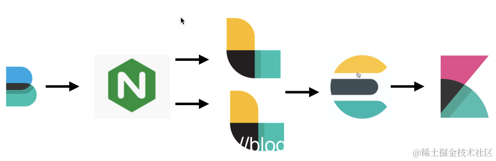 在上面,beats 收集的数据发送到 Nginx,然后再发送至 Logstash,再传入到 Elasticsearch,并最终在 Kibana 中展示。