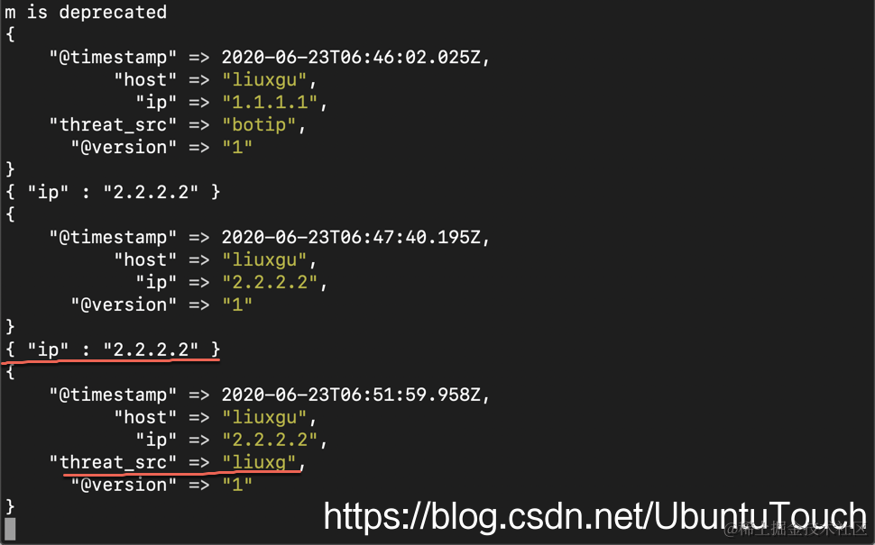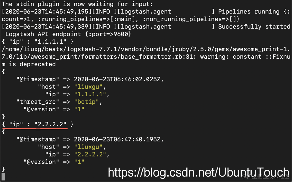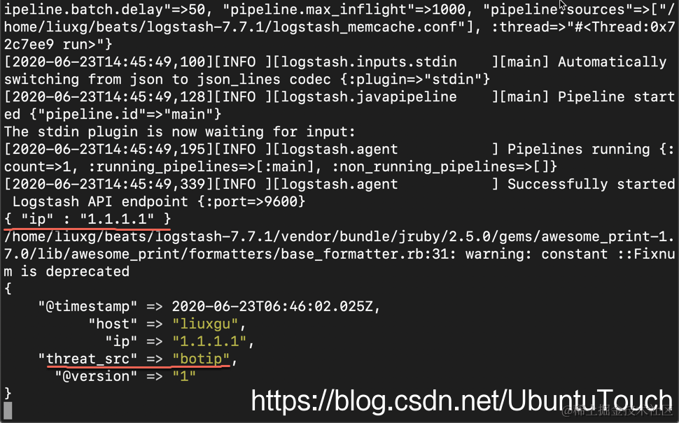 在上面我们使用 memcached filter 来丰富我们的数据。当数据和 memcahed 里的数据匹配后,把丰富的数据赋予给 threat_src 字段。运行起我们的 Logstash: