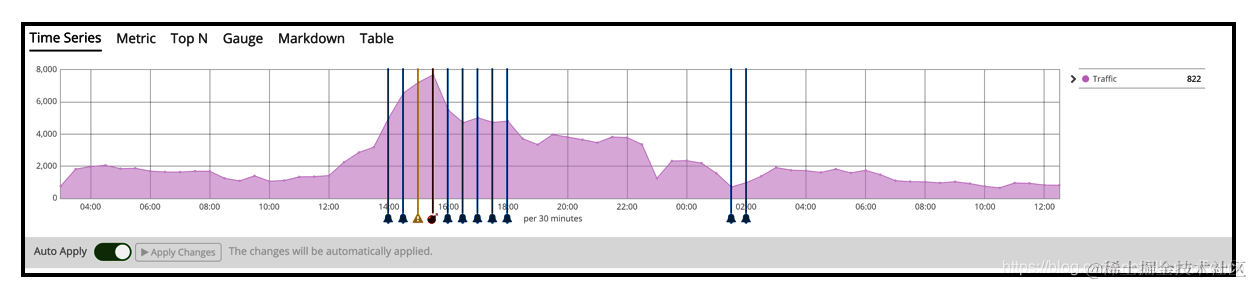 当我们把鼠标放到异常出现的红色的标志那里就可以看到 Anomaly score。这个是我们刚才在 Annotation 里进行设置的。