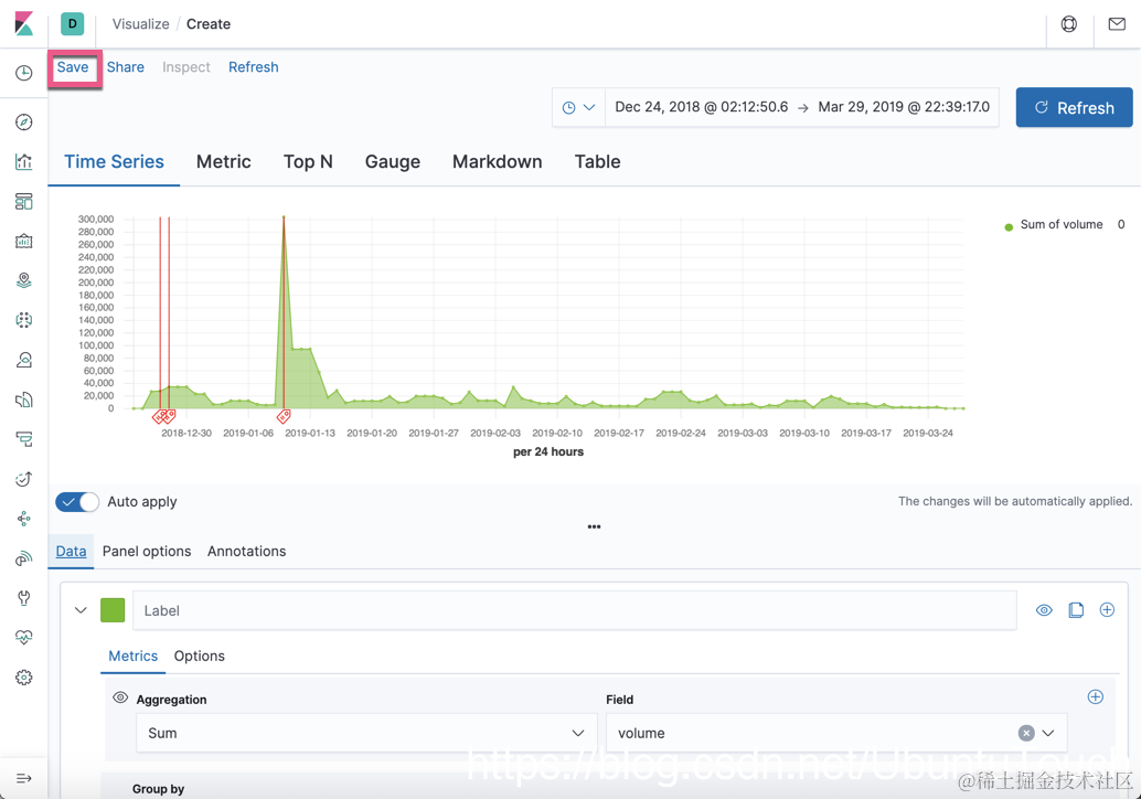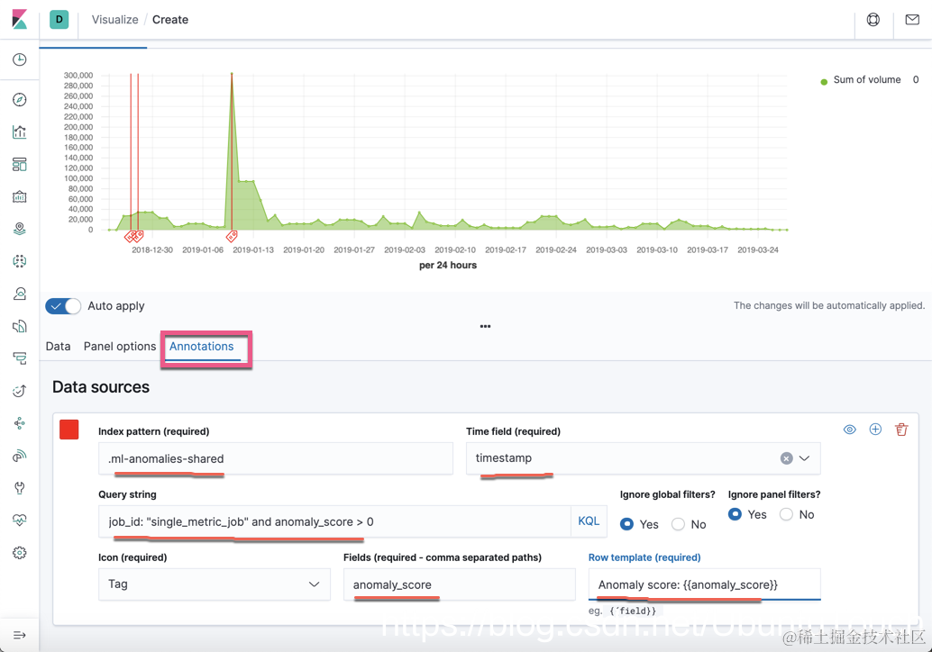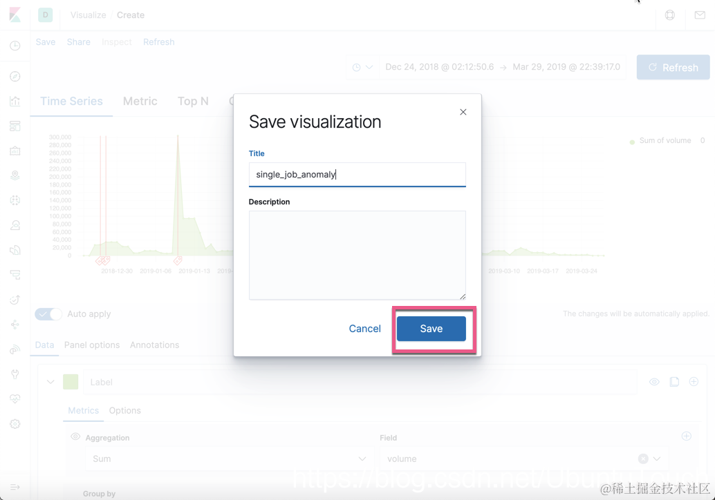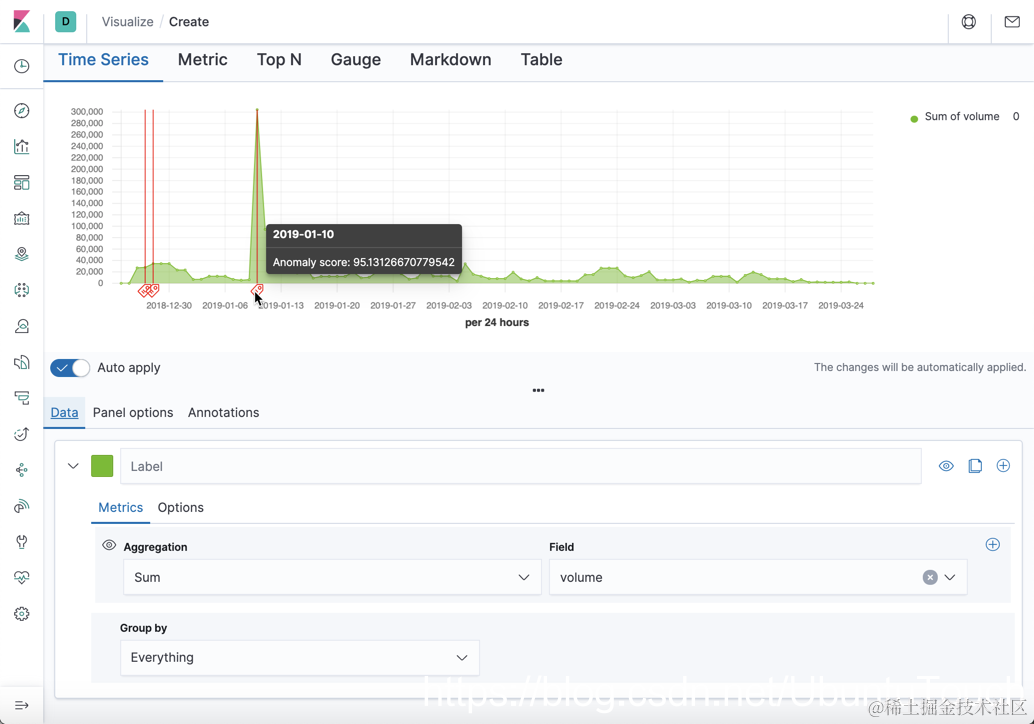 从上面,我们可以看出来一些和 ML 相关的索引。其中 .ml-anomalies-shared 就是这样的一个索引,其中含有我们机器学习作业里的异常数据。我们可以通过 TSVB 的方式来对它进行展示。