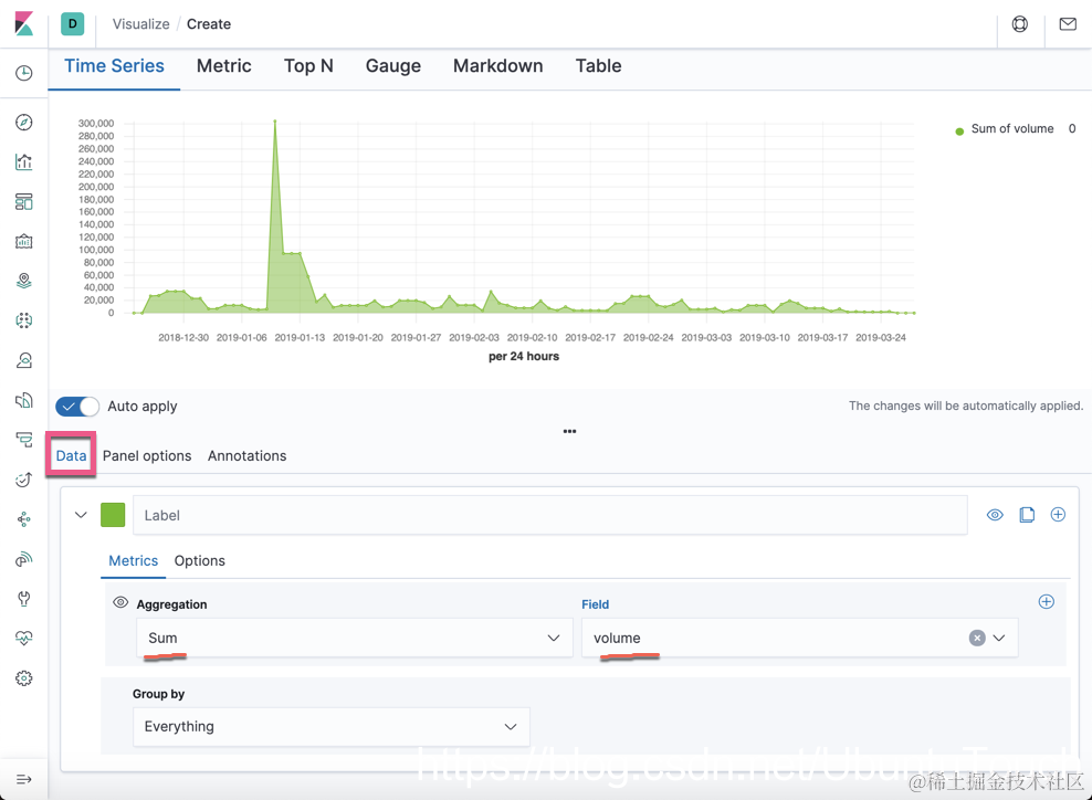在上面选择 cf_rfem_hist_price* 作为 index pattern。同时我们选择 1d 作为 interval。点击 Data: