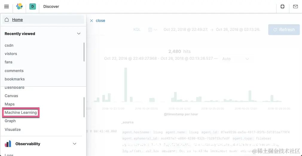 从上面我们可以看出来,我们的数据位于2018-10-22 日到2018-10-26之间。在上面我们可以看到一个叫做 message 的字段,它含有我们最原始信息的所有文字。这个 message 字段将在一下被用于 categorization。