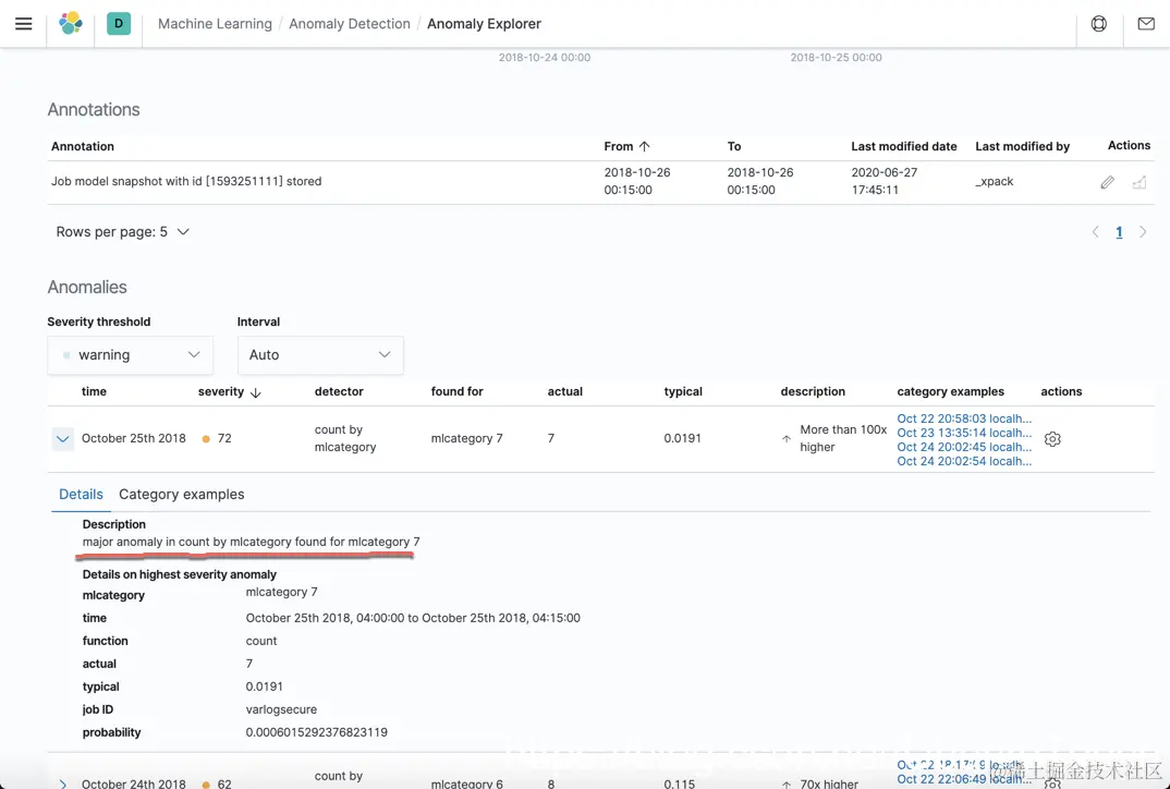 我们可以看到有一个是 mlcategory 7 的异常。它典型的值是0.00192,但是实际上它出现的事件总数是7 。属于一个不正常的事件。