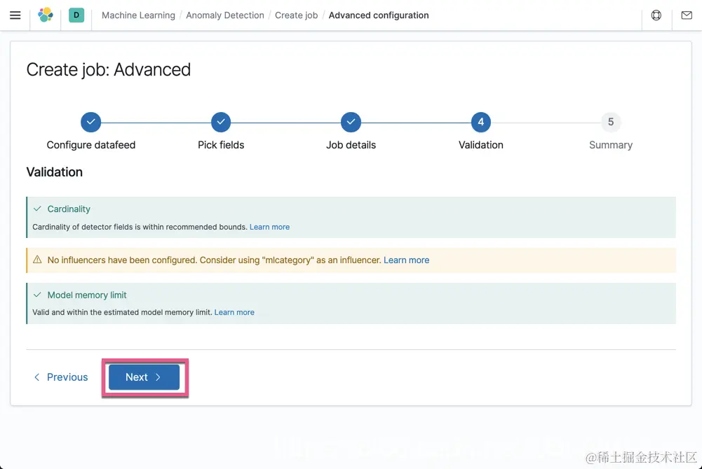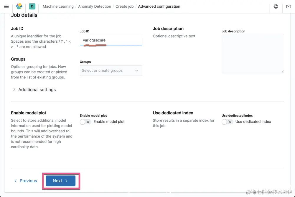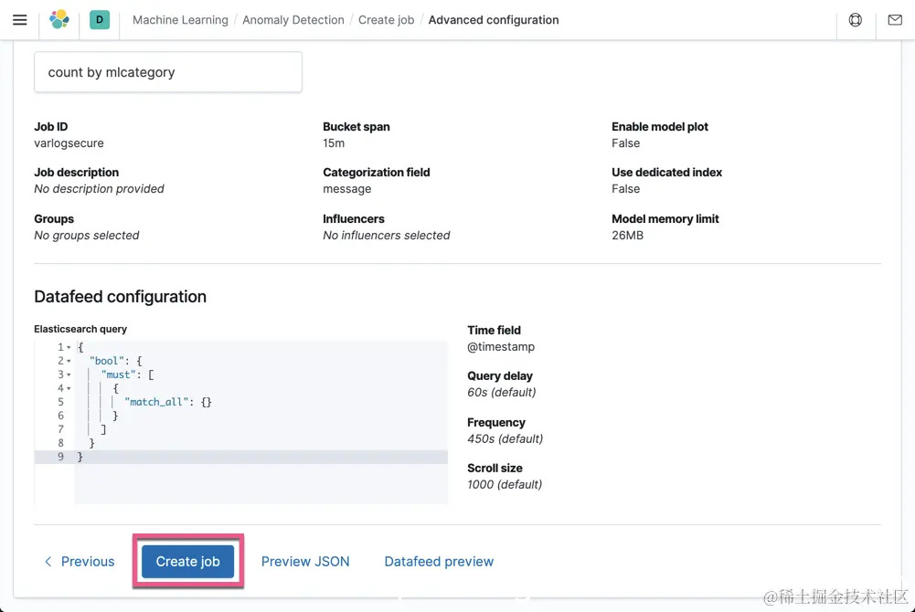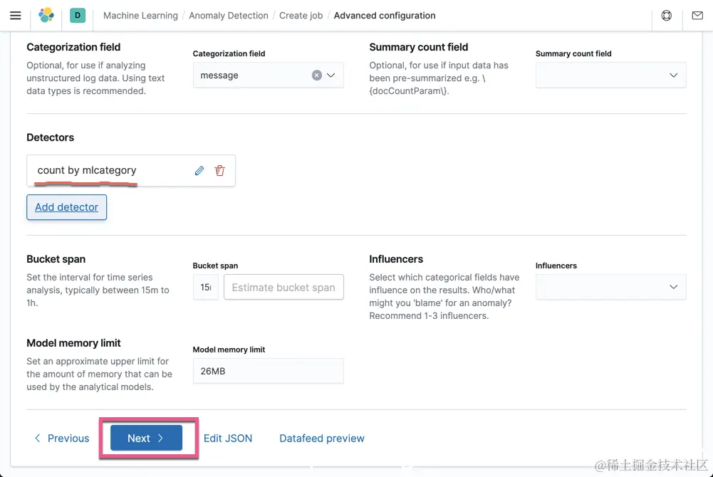 在 Categorization field 中,我们选择 message 字段。点击 Add detector: