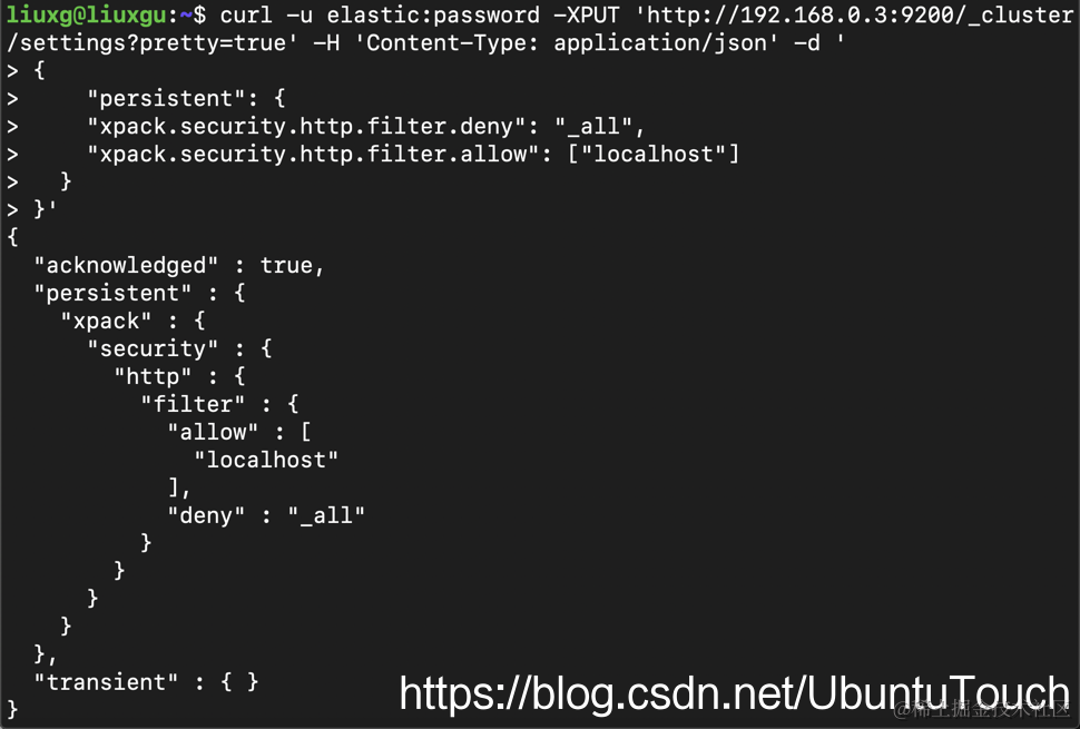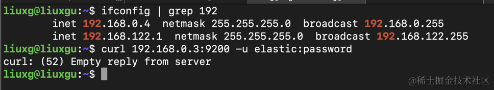 liuxg:~ liuxg$ curl 192.168.0.3:9200 -u elastic:password