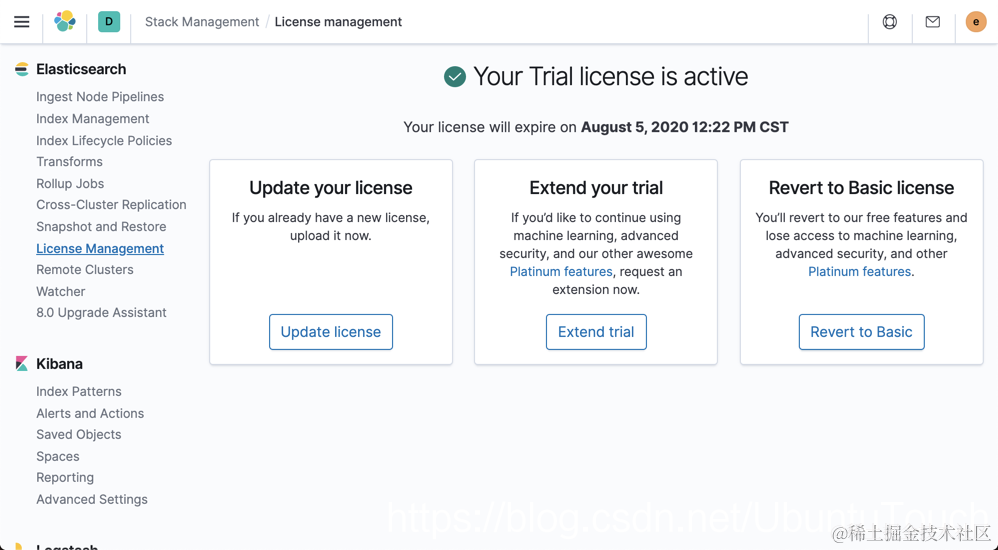 由于这个功能是 金和白金许可的一部分,那么我们必须在 Kibana 中启动30天试用: