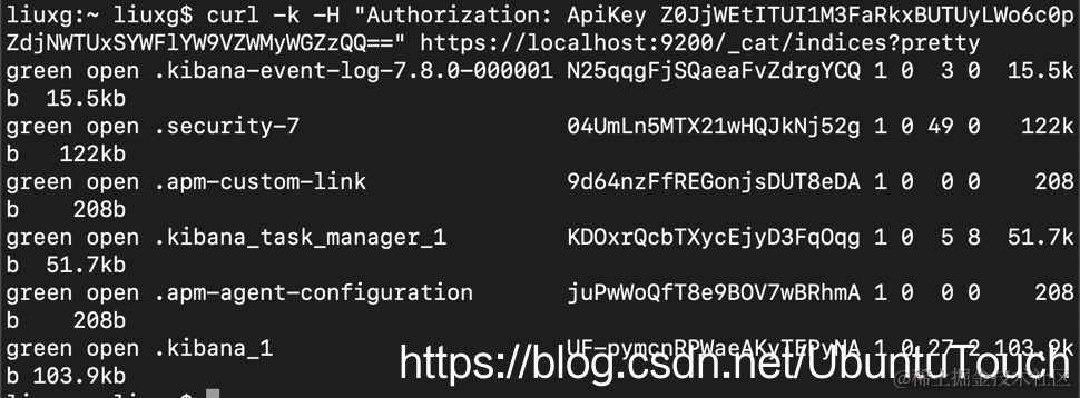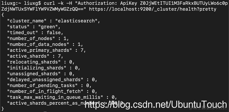 在这里,我们设置 API key 的有效期是1天。我们同时也给了一个名称 liuxg-api-key。执行完上面的指令后,我们可以看到如下的响应: