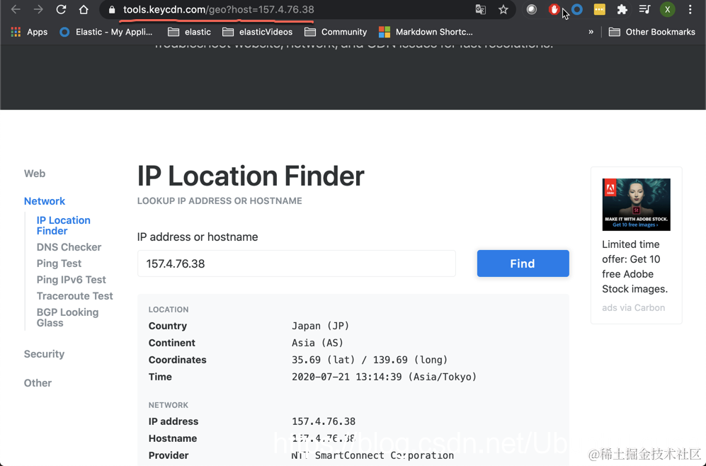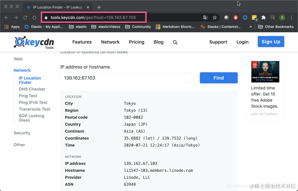 在 Kibana 中的很多查询中,我们会经常遇到显示 IP 地址的信息。这个 IP 地址可以在 Discover 的界面,或者是在一个表格里出现。假如我们想知道这个 IP 的地址是否为一个恶意的网站,或者我们想知道更多关于这个网站的信息。在很多的网站上,我们都可以查到这个信息,我们可以通过拷贝并粘贴的方式来操作这件事,比如在网站 tools.keycdn.com/geo?host=13… 我们可以查看到 IP 地址 139.162.67.103 的信息: