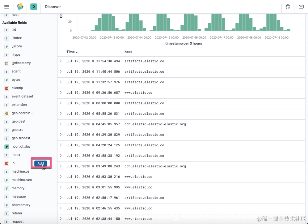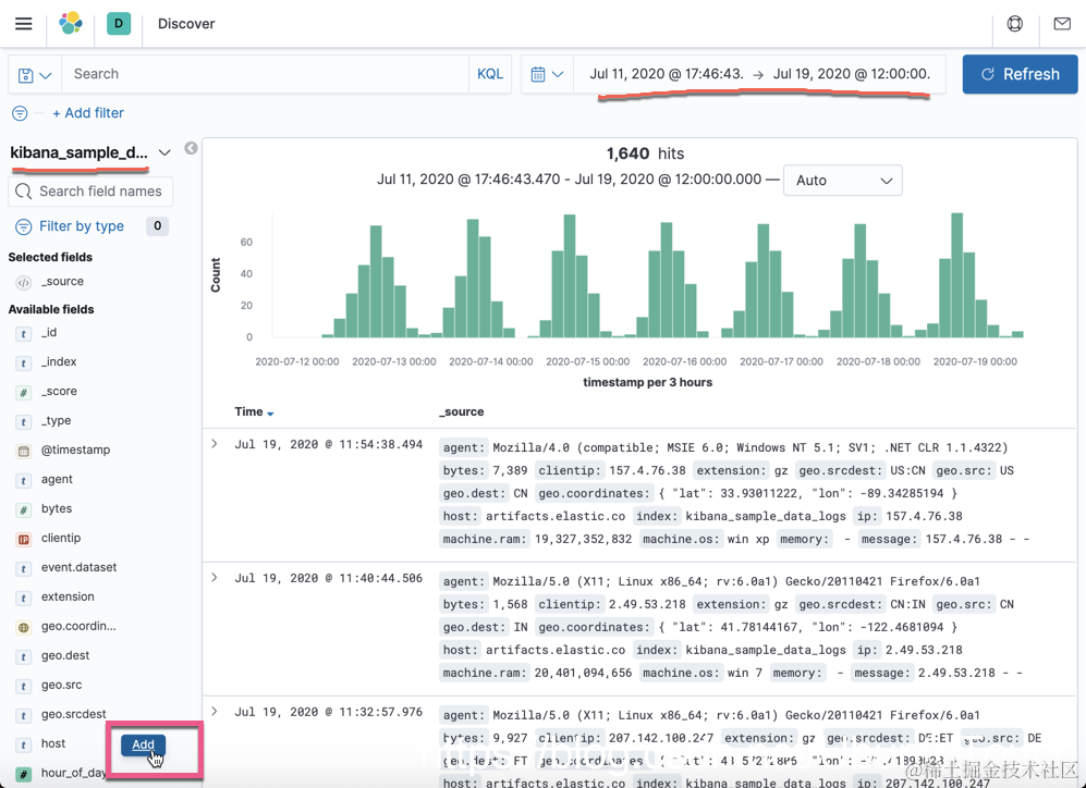 我们选择我们需要的索引 kibana_sample_data_logs,并选择相应的 time picker 选择。点击上面的 Add 按钮: