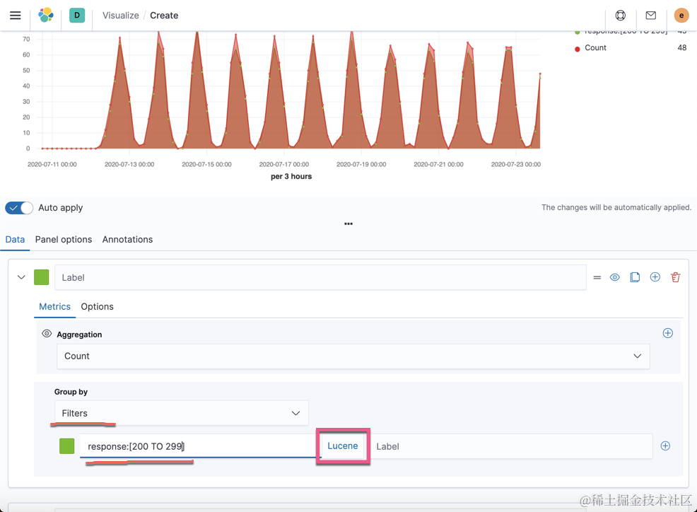 在下面的 TSVB 里查找不是 200 - 299 里的所有的文档数。点击右边的 + 号添加另外一个 aggregation:
