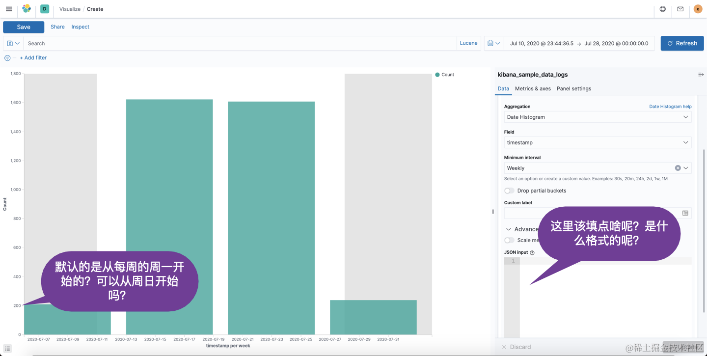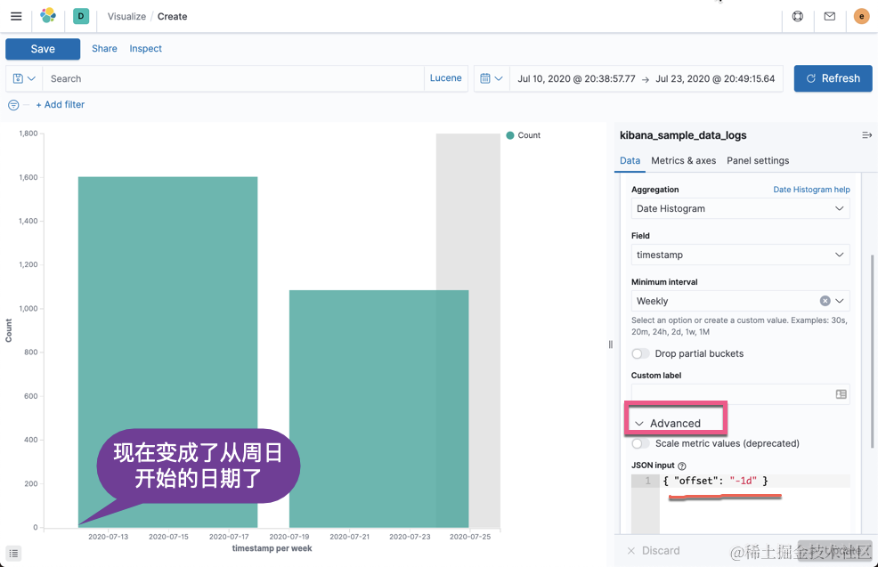如上图所示,当我们在做可视化时,有一个高级地定制框。你是否从来没有用过,而一直采用默认的配置?比如我们在使用 Date Histogram 时,你的老板可能希望你能从每天的周日开始进行统计而不是从默认的周一开始来进行数据的统计。我们该怎么做呢?
