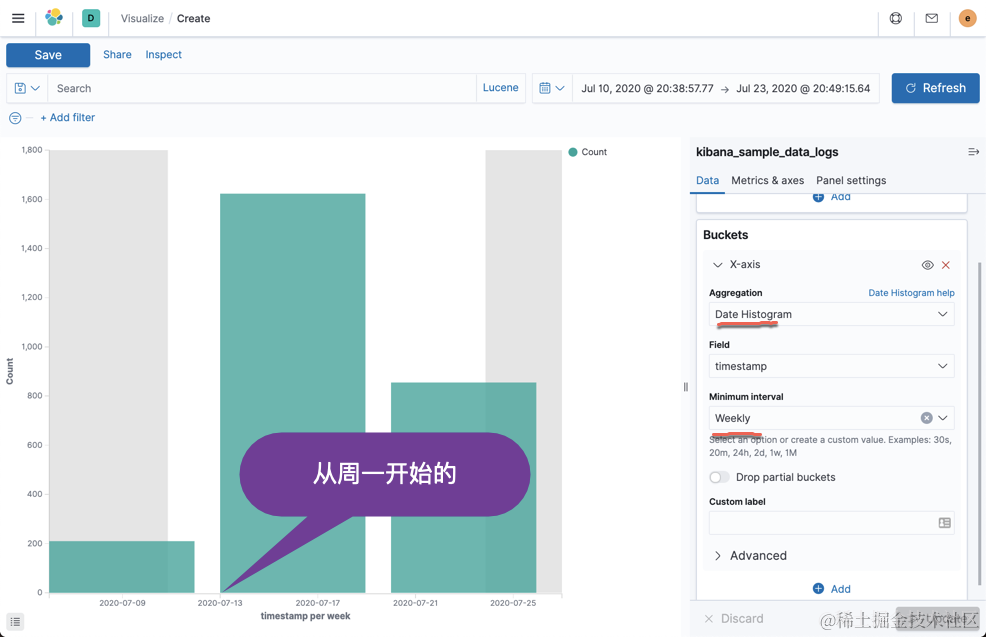 从上面的返回的数据来看,我们可以看出来返回的数据的 key_as_string 所显示的日期都是从星期一开始的。07-06,07-20, 07-27 等等。