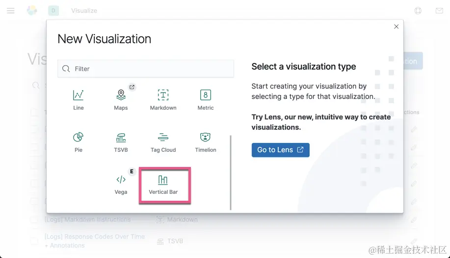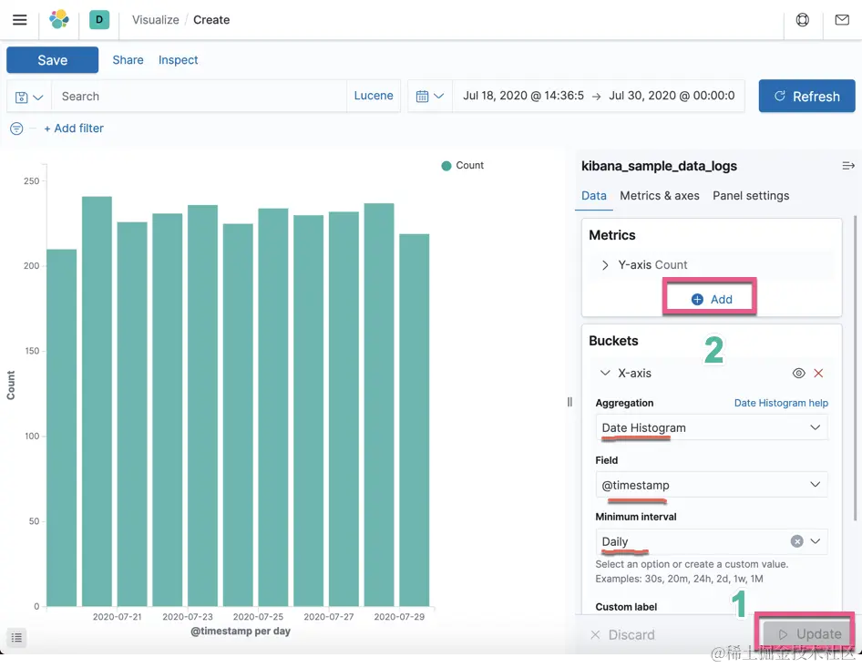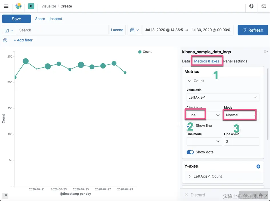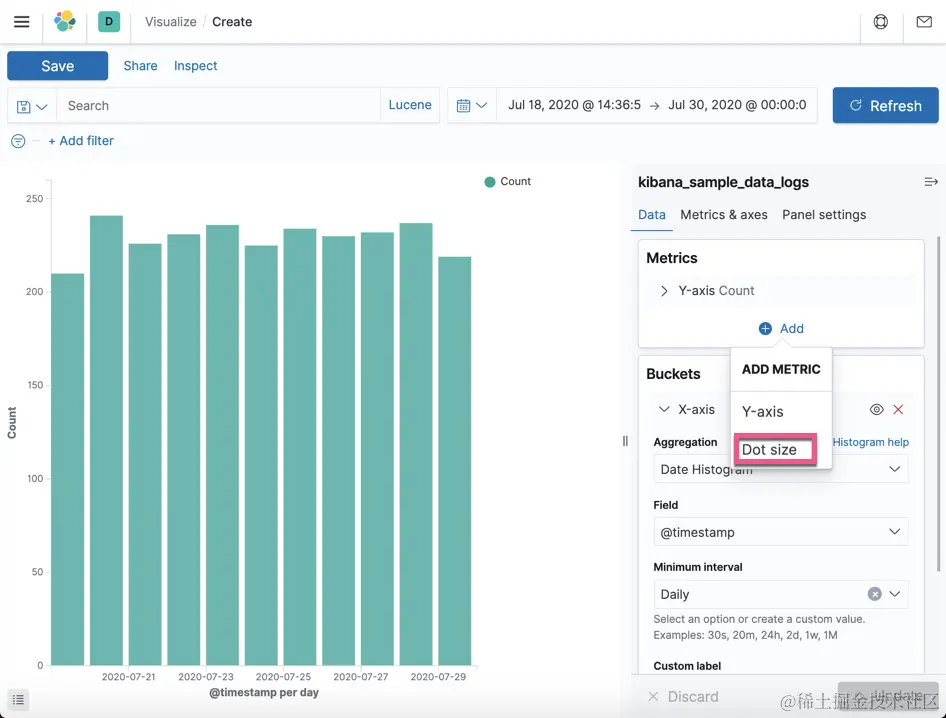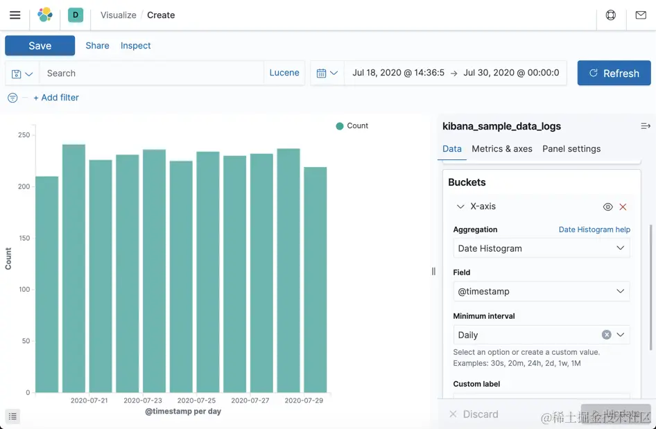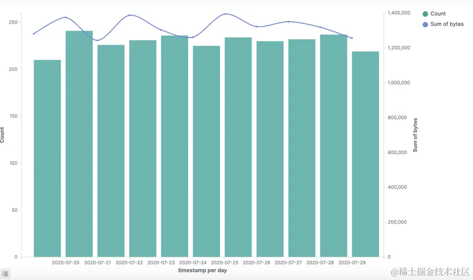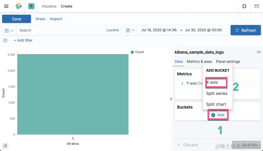 到现在,我们已经生成了第一个可视化图,在 Y 轴上也显示了第一个 metric:在每个 bucket 文档的数量。