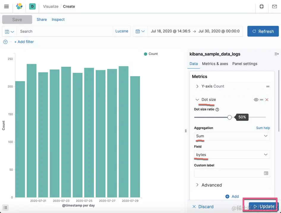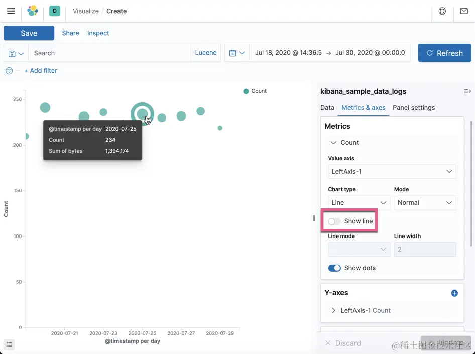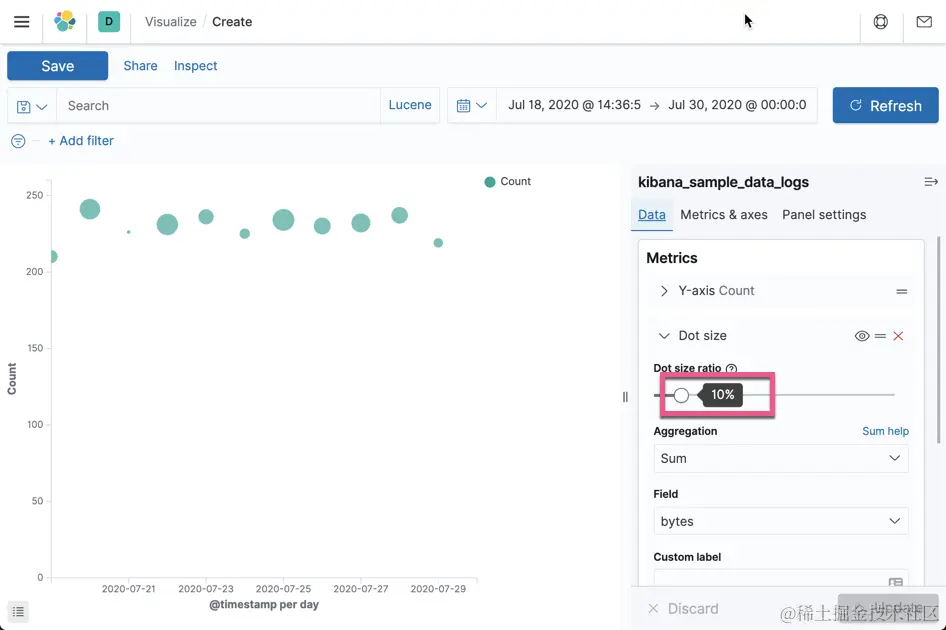 在上面我使用了两个不同的 Y 轴来表示这个统计的结果。现在的问题是,我们有没有办法把这上面的两个指标合并为一个呢?特别是在有些情况下,我们可能有更多的指标显示,那么我们的 Y 轴也只有两个(左边和右边),那么我们的显示将会非常难看。答案是我们可以使用 Dot size。