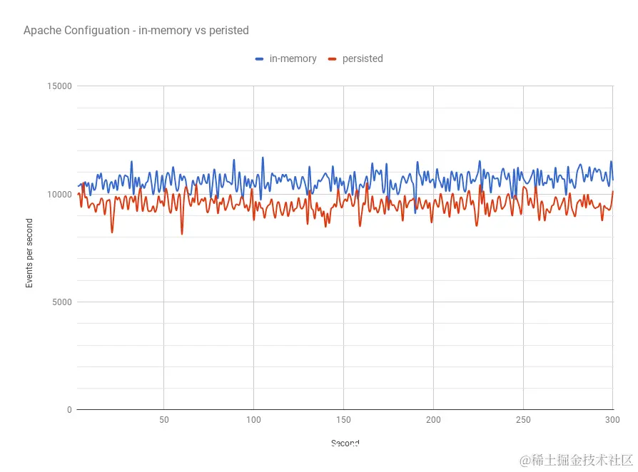 基准测试结果显示,在此配置中使用持久队列时,性能下降约10%。 使用内存队列可以平均每秒产生约10600个事件,而使用持久队列则每秒可以产生约9500个事件。