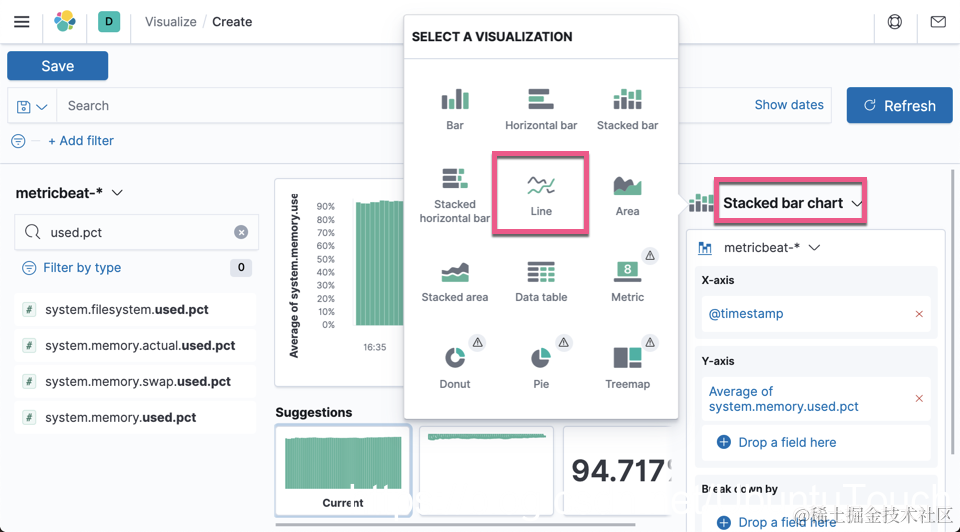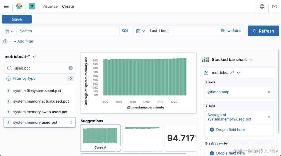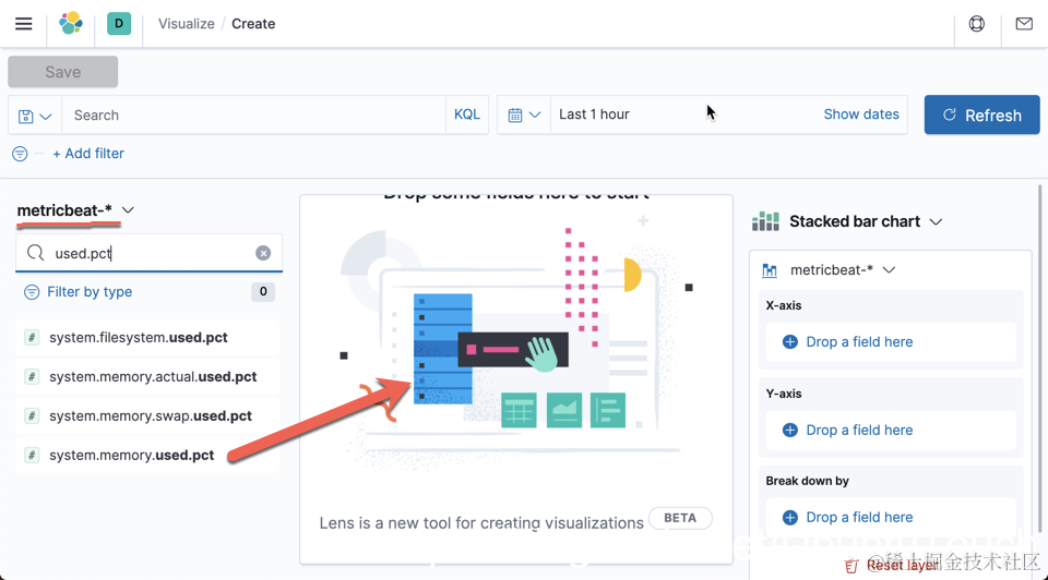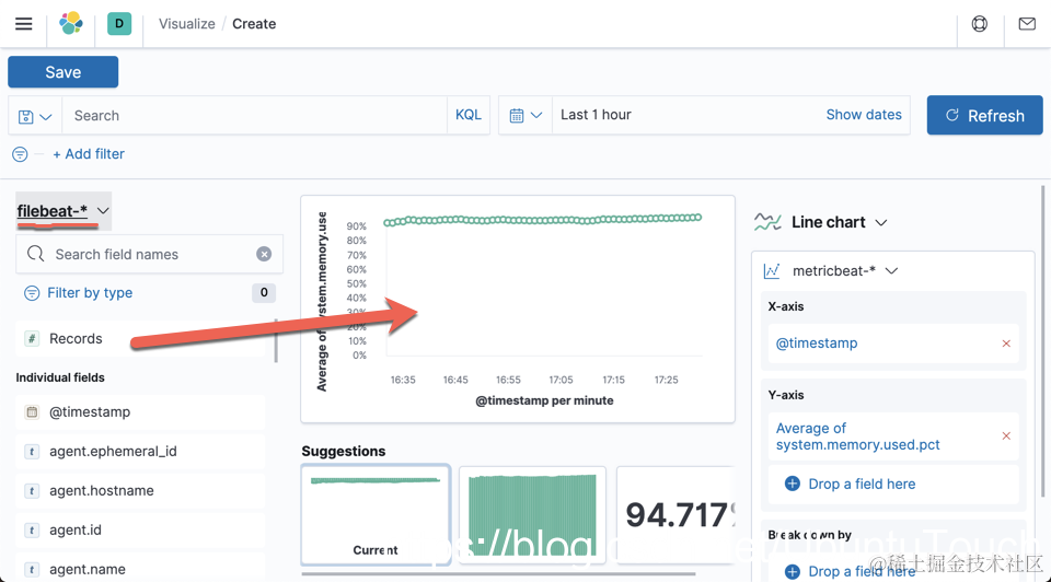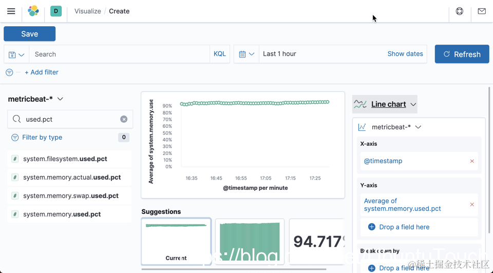选择 metricbeat-*。我们可以拖拽 system.memory.used.pct 到中间的显示区: