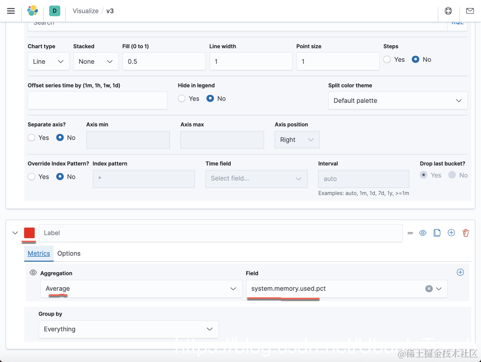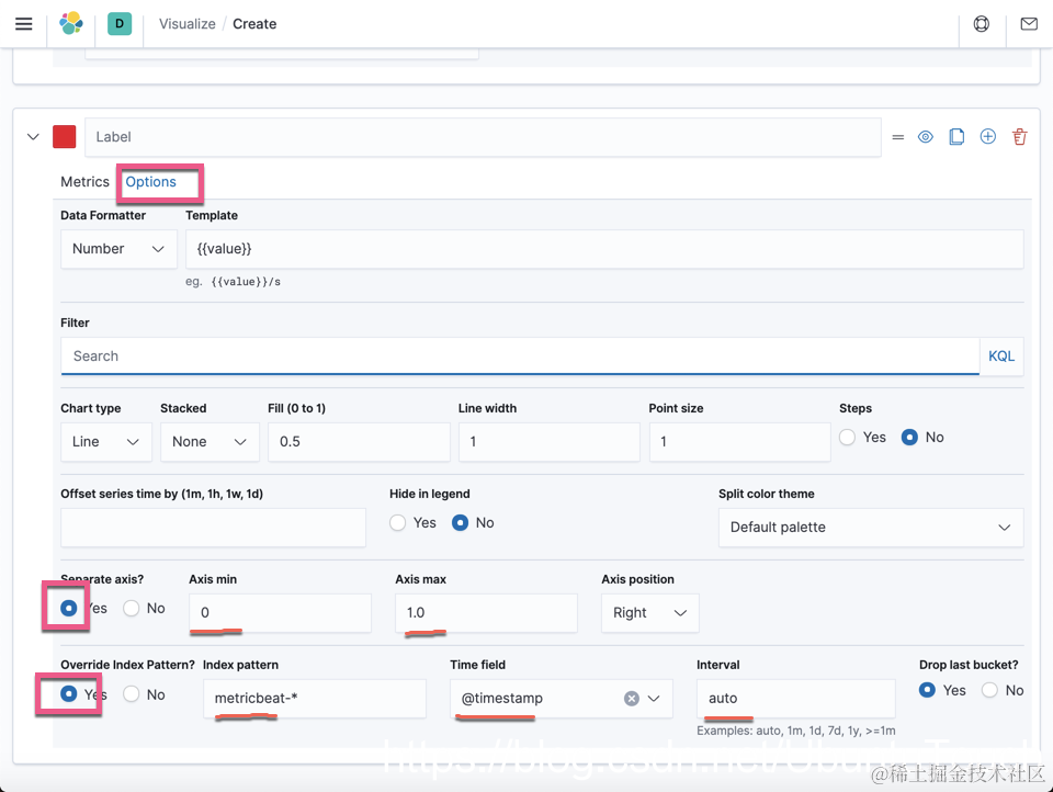 我们按照上面来进行配置。记得我们需要输入 metricbeat-* 索引模式。接下来我们来配置它的指标: