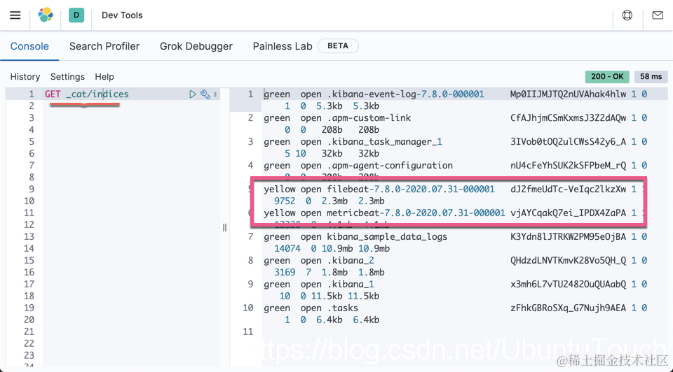 当我们启动完毕后,我们可以在 Kibana 中查看到这两个索引: