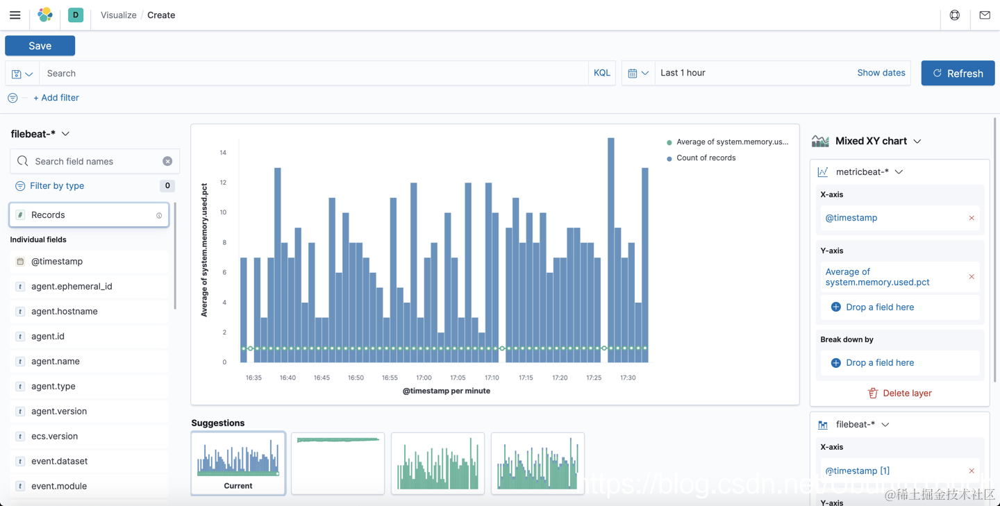 在今天的展示中,我们将使用 filebeat 及 metricbeat 的数据同时展现在同一个可视化的图中。我们将使用两种方法: