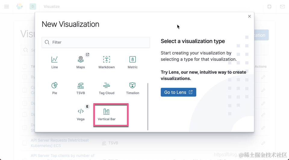 在我们正常的可视化图中,我们没有办法使用两个及以上的索引模式来进行数据的展示,比如,当我们选择 Vertical Bar 可视化时: