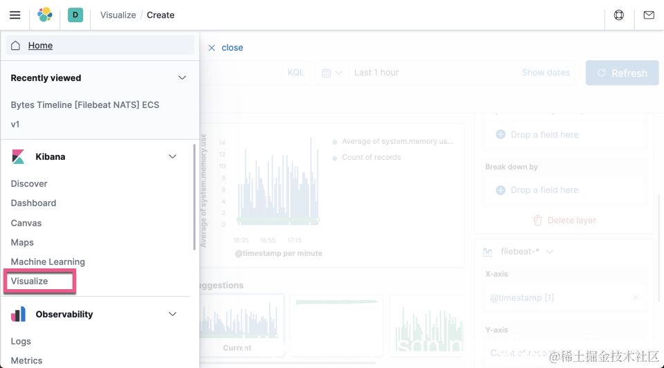 我们可以很方便地使用 Kibana Lens 来建立使用两个不同的索引的可视化图。打开 Kibana: