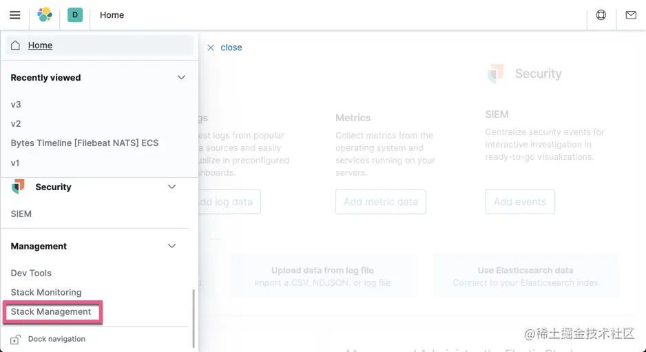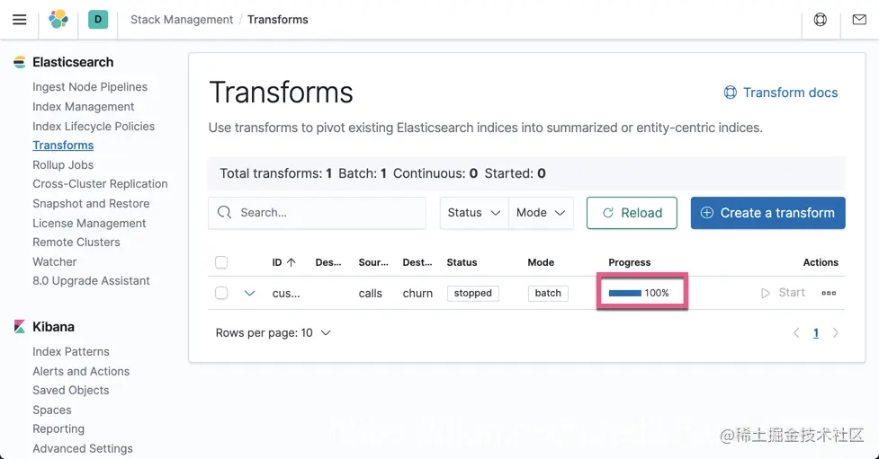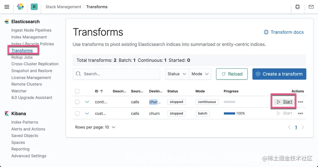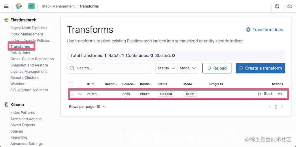 当我们运行完上面的命令后,我们进入到 Stack Management 界面,并点击 transforms: