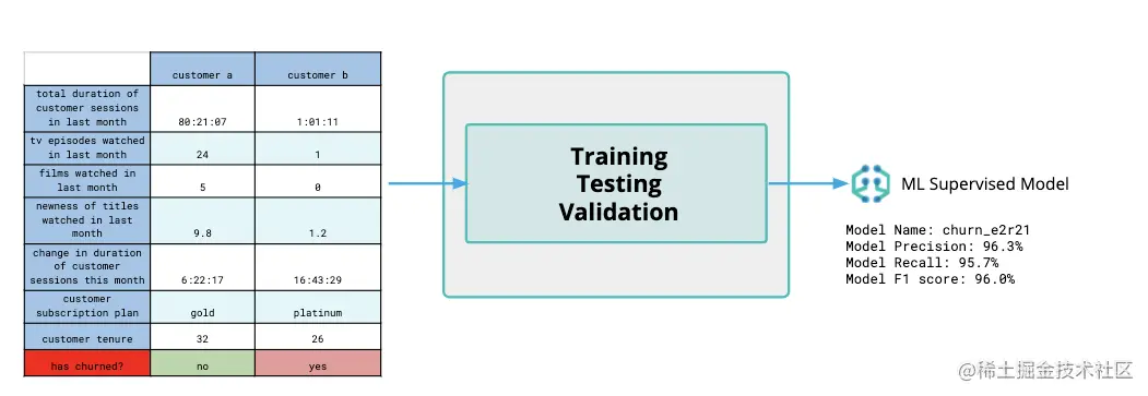 在此示例中,我们将根据客户元数据和呼叫日志的功能预测电信客户是否会流失。 我们将使用流失客户和未流失客户的示例作为培训数据集。