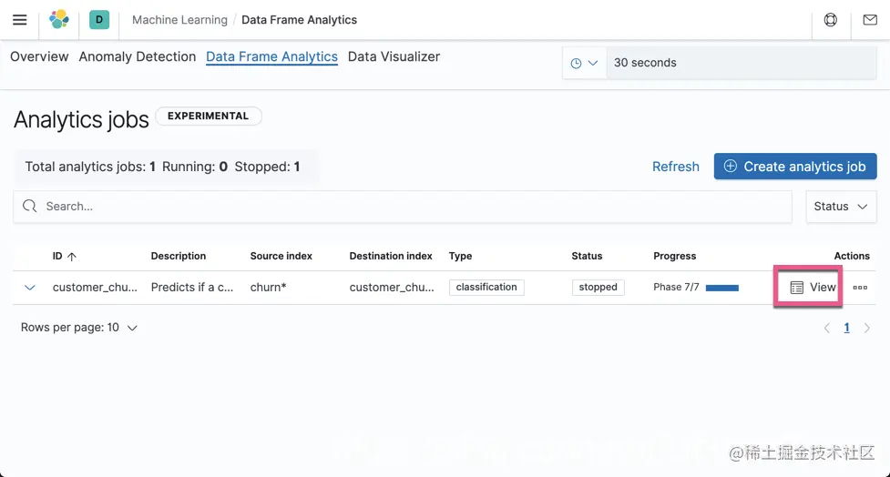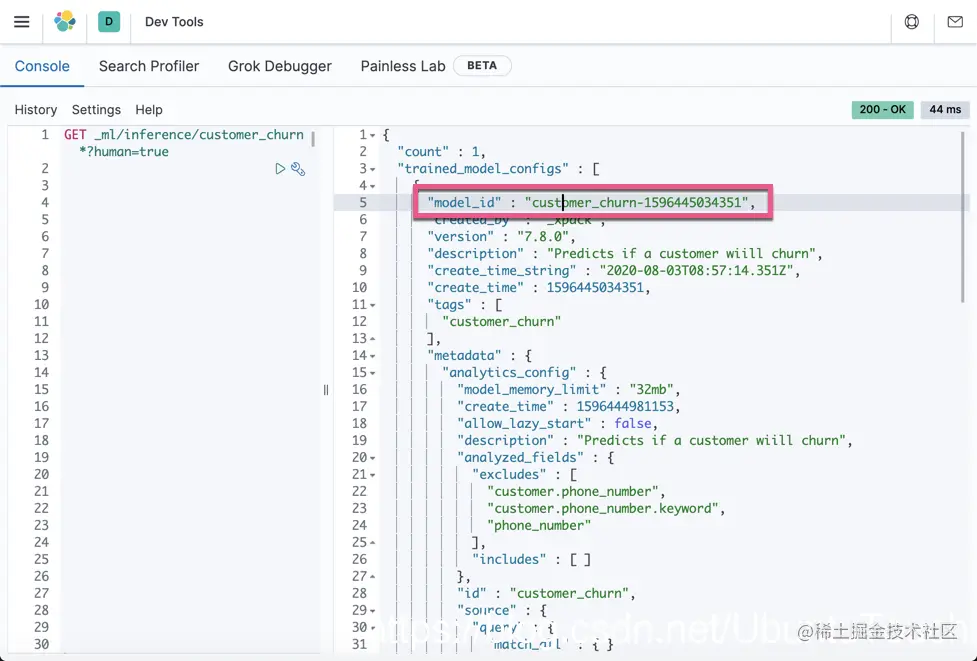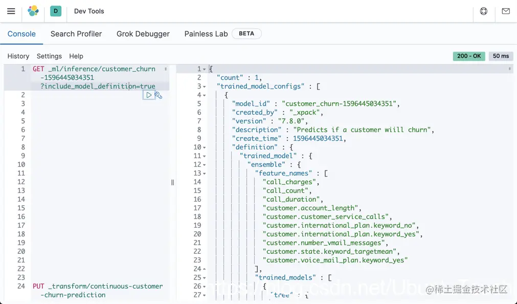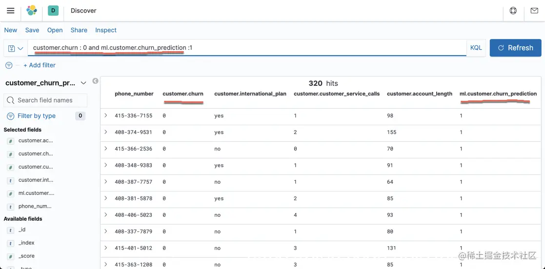 当变换看到新数据时,它将创建我们的功能集并根据模型进行推断。 该预测与丰富的数据一起被索引为 churn_predictions。 这一切都是连续发生的。 随着新的客户呼叫数据的到来,转换将更新我们的客户流失预测。 预测是索引中的数据。 这意味着我们可以通过警报进行操作,使用 Lens 构建可视化文件或构建自定义仪表板。