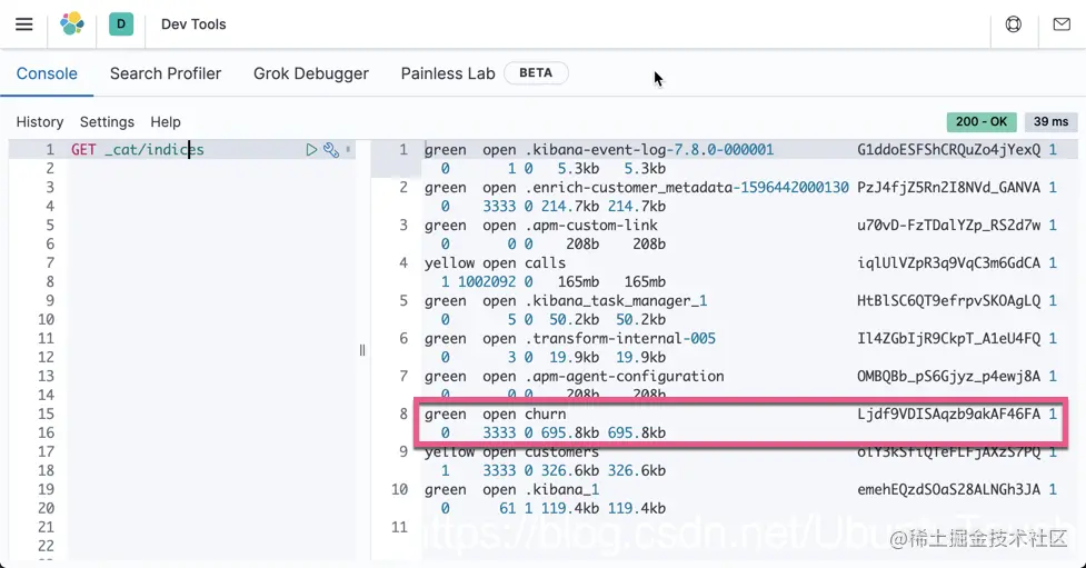 你可以参阅我之前的文章 “Kibana: 运用Data Visualizer来分析CSV数据” 来把上面的两个 csv 的数据集导入到 Elasticsearch 中。应该是非常直接的。当我导入完 calls.csv 及 customers.csv 后,我们可以在 Kibana 中查看到如下的两个索引:
