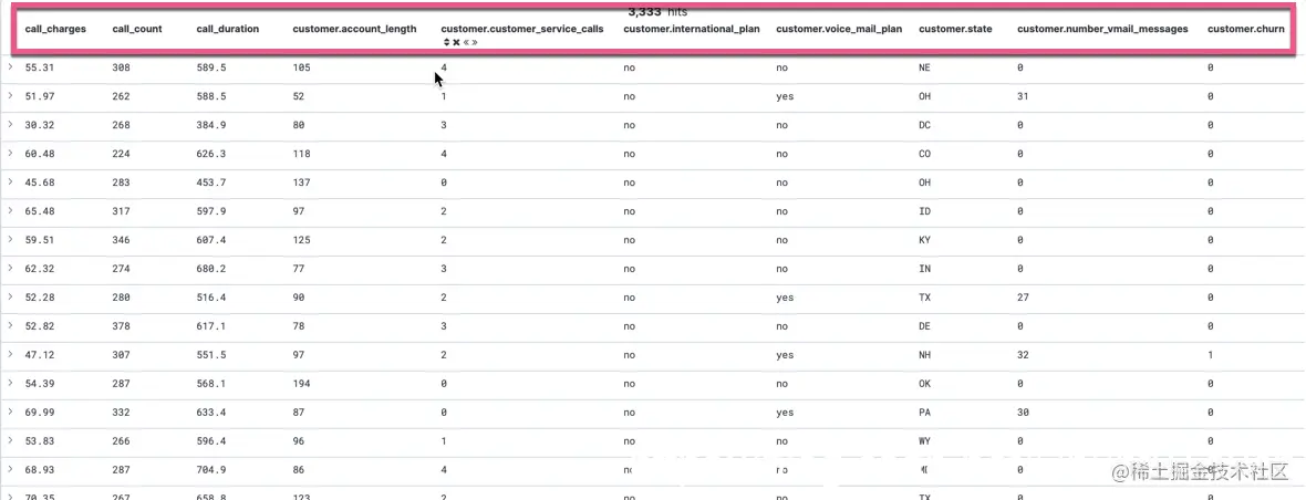 注意上面的 column1 字段表示为在 csv 文档中的第一列。是个系列号。customers 索引共有 3333 个数据。其中的一个单词 churn 表示客户是否流失过。1 表示流失过,0则表示没有。