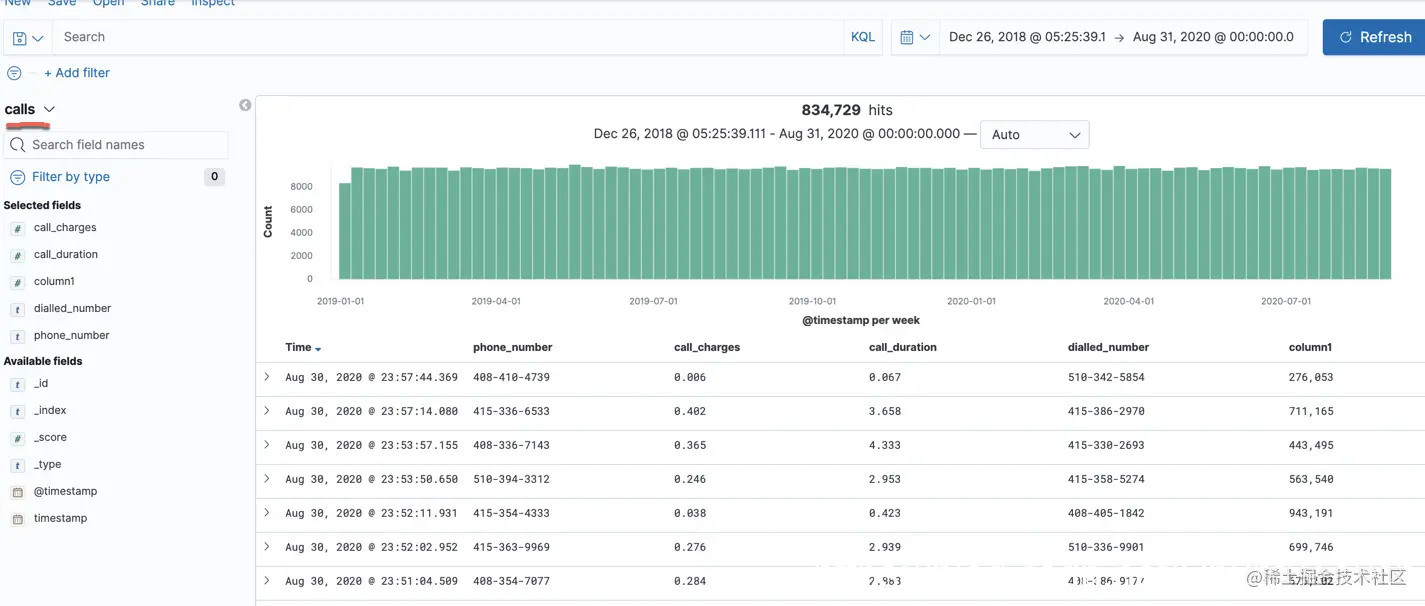 注意上面的 column1 字段表示为在 csv 文档中的第一列。是个系列号。calls 索引共有 1002092 个数据。