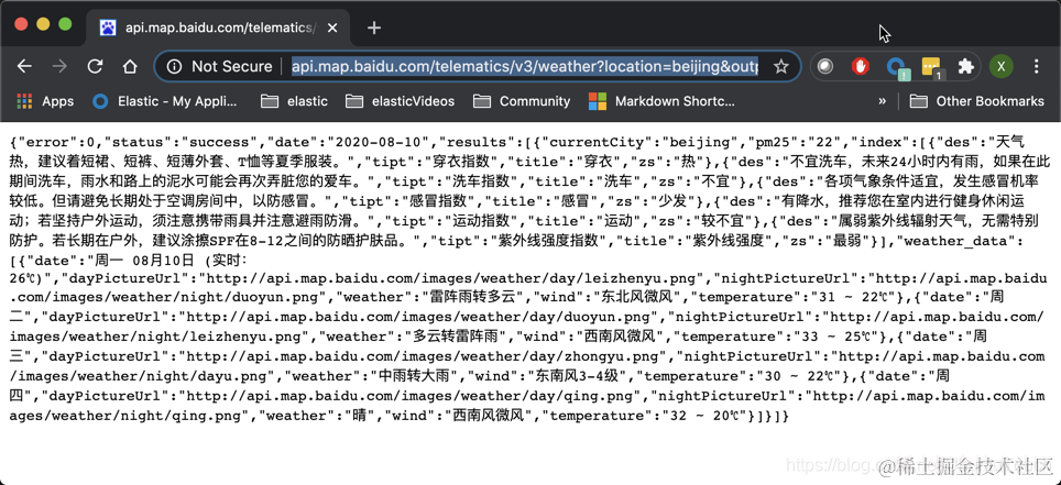 如上所示,它是一个百度天气的接口。在上面我们把 beijing 换成其他的城市,我们就可以得到那个城市的天气情况。