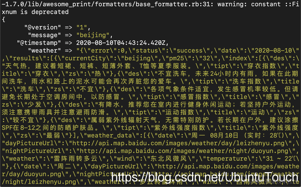url => "http://api.map.baidu.com/telematics/v3/weather?location=%{[message]}&output=json&ak=DdzwVcsGMoYpeg5xQlAFrXQt"