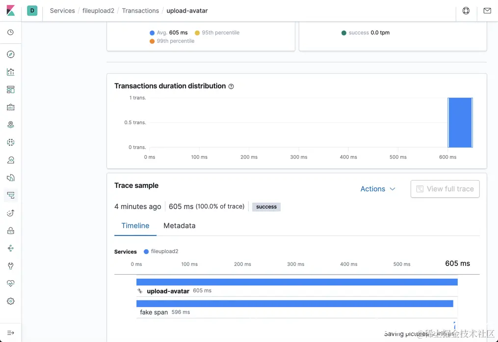 显然这个是我们之前在 nodejs 里定义的那个 transaction 的名字。点击上面的 upload-avatar 超链接: