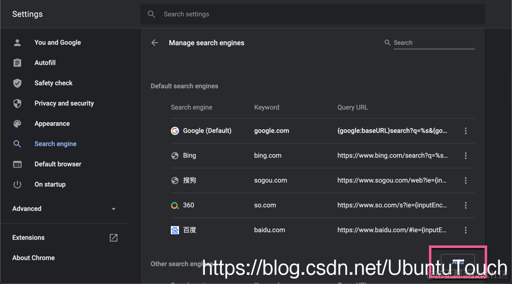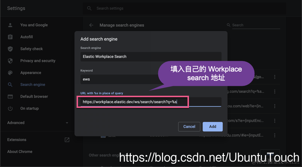 在上面,我的 Workplace Search 的地址为 workplace.elastic.dev/ws/search。你需要根据自己的实际的地址进行填入。点击上面的 Add 按钮。这样我们在 Chrome 的设置就已经配置好了。