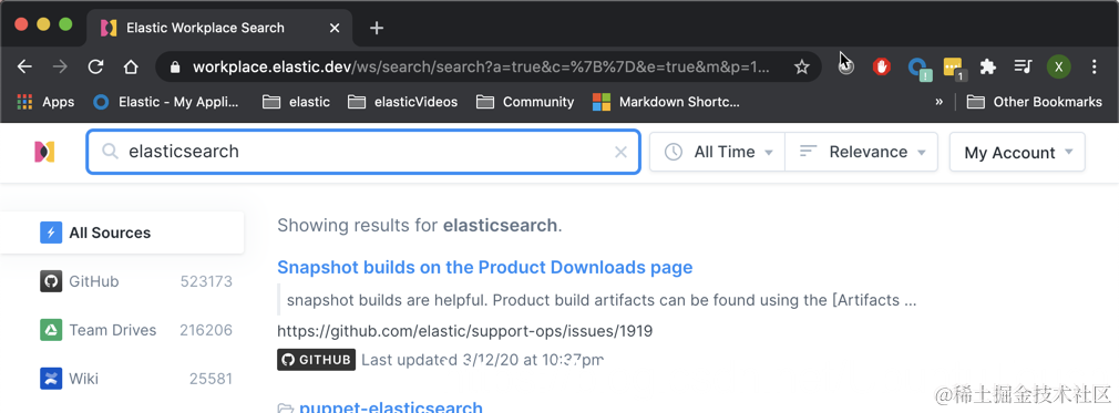 我们接下来就可以看到所有的有关 elasticsearch 的来自 github, Team Drives 及 wiki 的所有的文档。